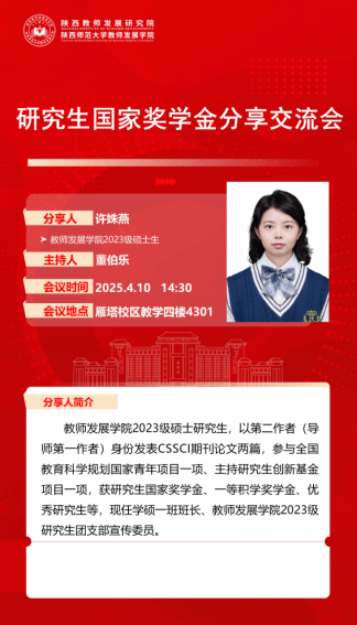 本次分享交流会邀请cableav 2024年国家奖学金获得者,2023级教育经济与管理专业硕士生许姝燕同学进行经验分享。
